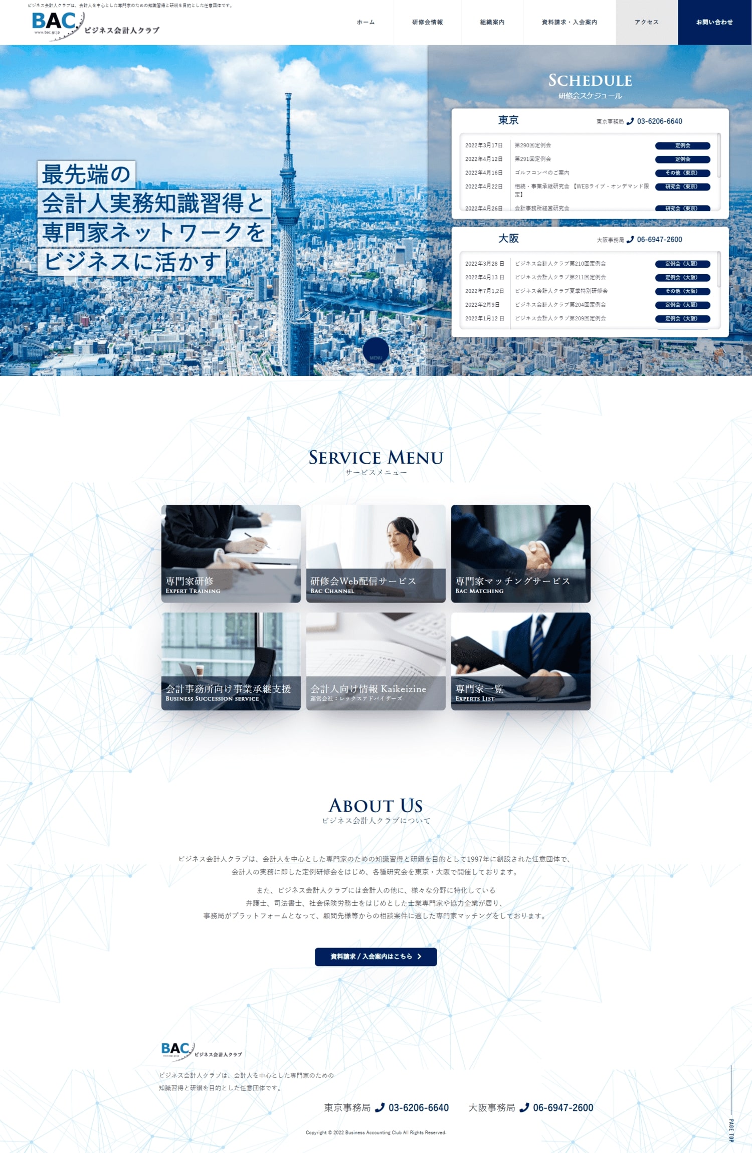 ビジネス会計人クラブ サイトリニューアル Webページ 2022年02月21日 URL http://bac.gr.jp/製作者 サイト制作チーム(カワカミ・タマシロ・ヒガ・タニガワ)制作時期 2021.12コンセプト 既存サイトが8年前に制作サイトであったため、最近トレンドのメインヴィジュアルのサイズを画面の最大化やスクロールした際の動き(フェードイン)、パララックス効果でサイトを立体的に見えるよう工夫しています。 UXでは、研修会、勉強会の情報をTOPへ掲載することと、お客様も手動で掲載するのではなく、自動で表示する為phpでシステム化を行いました。タグ 白 青 サービス 事務所 スタイリッシュ 紺